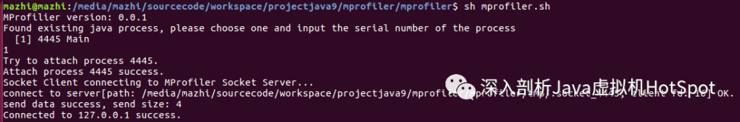 通过mprofiler.sh脚本启动MProfiler后,会列出所有活跃的Java进程,选择要检测的目标进程,这里选择序号为1的Main程序,attach成功后会显示MRPOFILER字样的logo,如下: