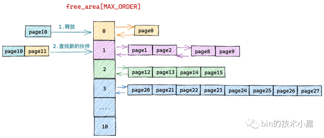 以下是系统中空闲内存页在当前伙伴系统中的组织视图,现在我们需要将 page10 释放回伙伴系统中: