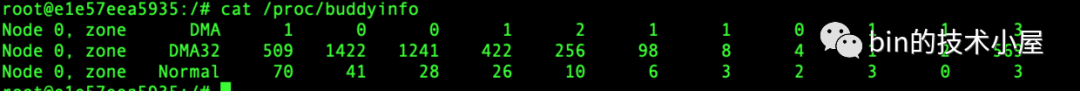 我们可以通过 cat /proc/buddyinfo 命令来查看 NUMA 节点中不同内存区域 zone 的伙伴系统当前状态: