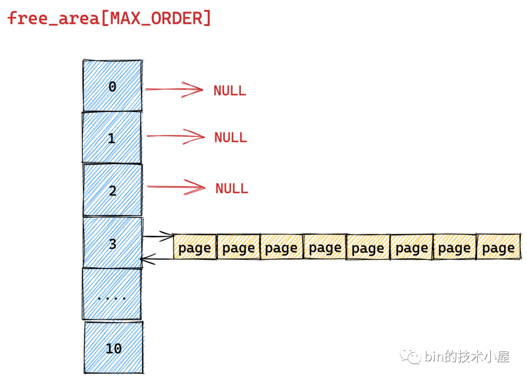 数组 free_area[MAX_ORDER] 中的索引表示的就是分配阶 order,用于指定对应双向链表组织管理的内存块包含多少个 page。