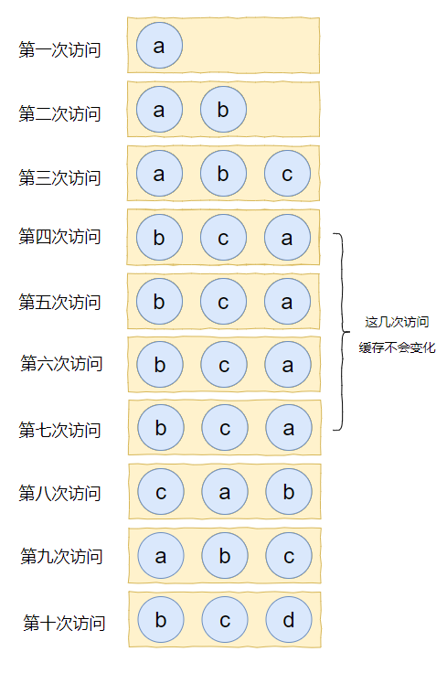 十次访问结束后,缓存中剩下的是 b,c,d 这三个元素。