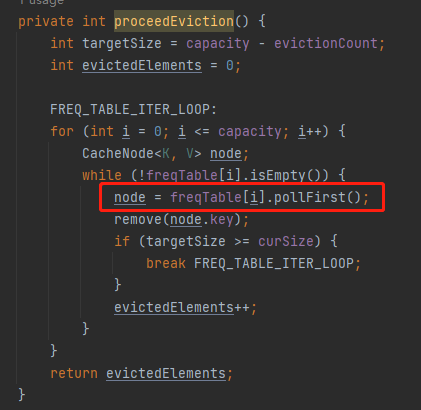 前面说了,淘汰策略,proceedEviction 方法,是从 freqTable 数组的第一个坑位开始遍历数组,如果这个坑位下挂的有链表,然后开始不断的移除头结点,直到驱逐指定个数的元素。
