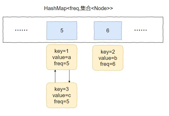 当这个请求过来的时候,链表中的 value=a 的节点的频率(freq)就变成了2。