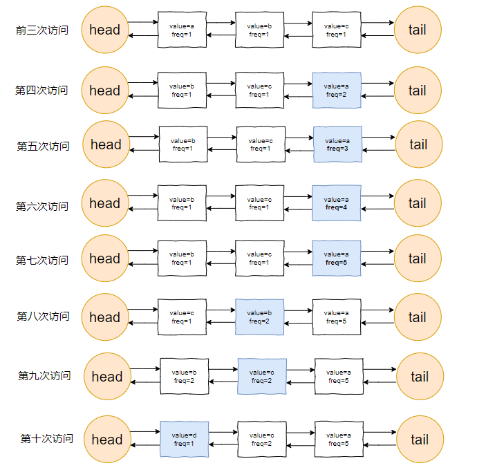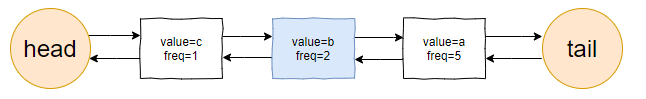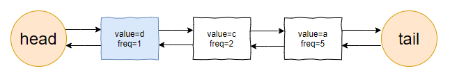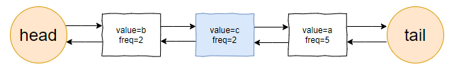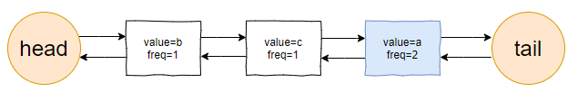 对于目前三个元素来说,value=a 是频次相同的情况下,最久没有被访问到的元素,所以它就是 head 节点的下一个元素,随时等着被淘汰。