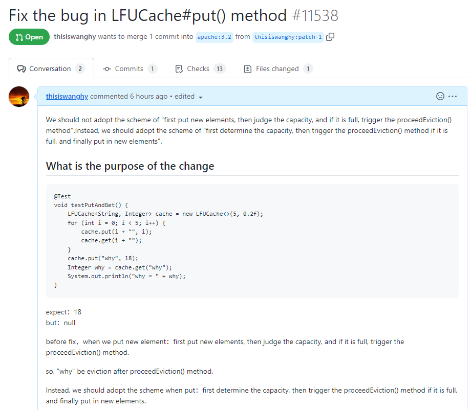 但是直到我遇到了 Dubbo 的这个 LFUCache 的 BUG,它的修复方案,只是需要交换两行代码的顺序就完事儿了,更加简单。