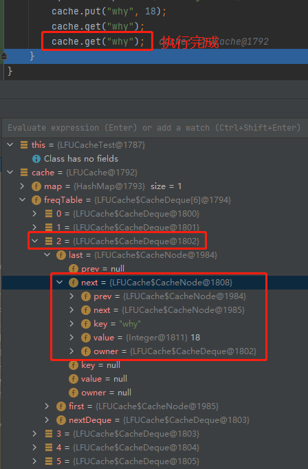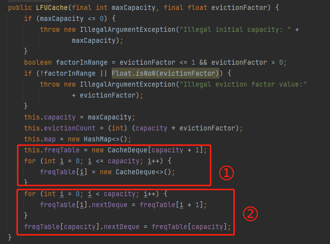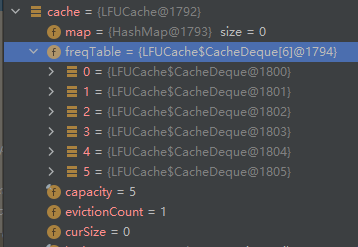 在下面标号为 ① 的地方,表示它是一个长度为 capacity+1 的数组,即长度为 6,且每个位置都 new 了一个 CacheDeque 对象。