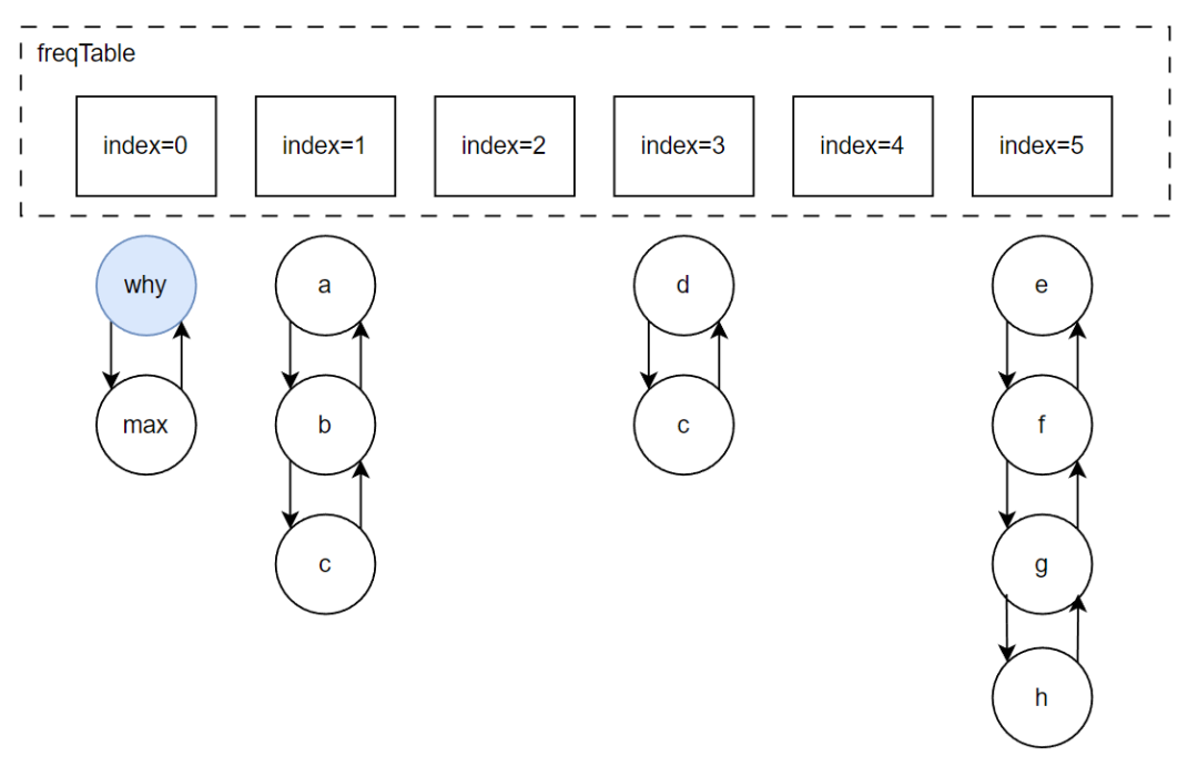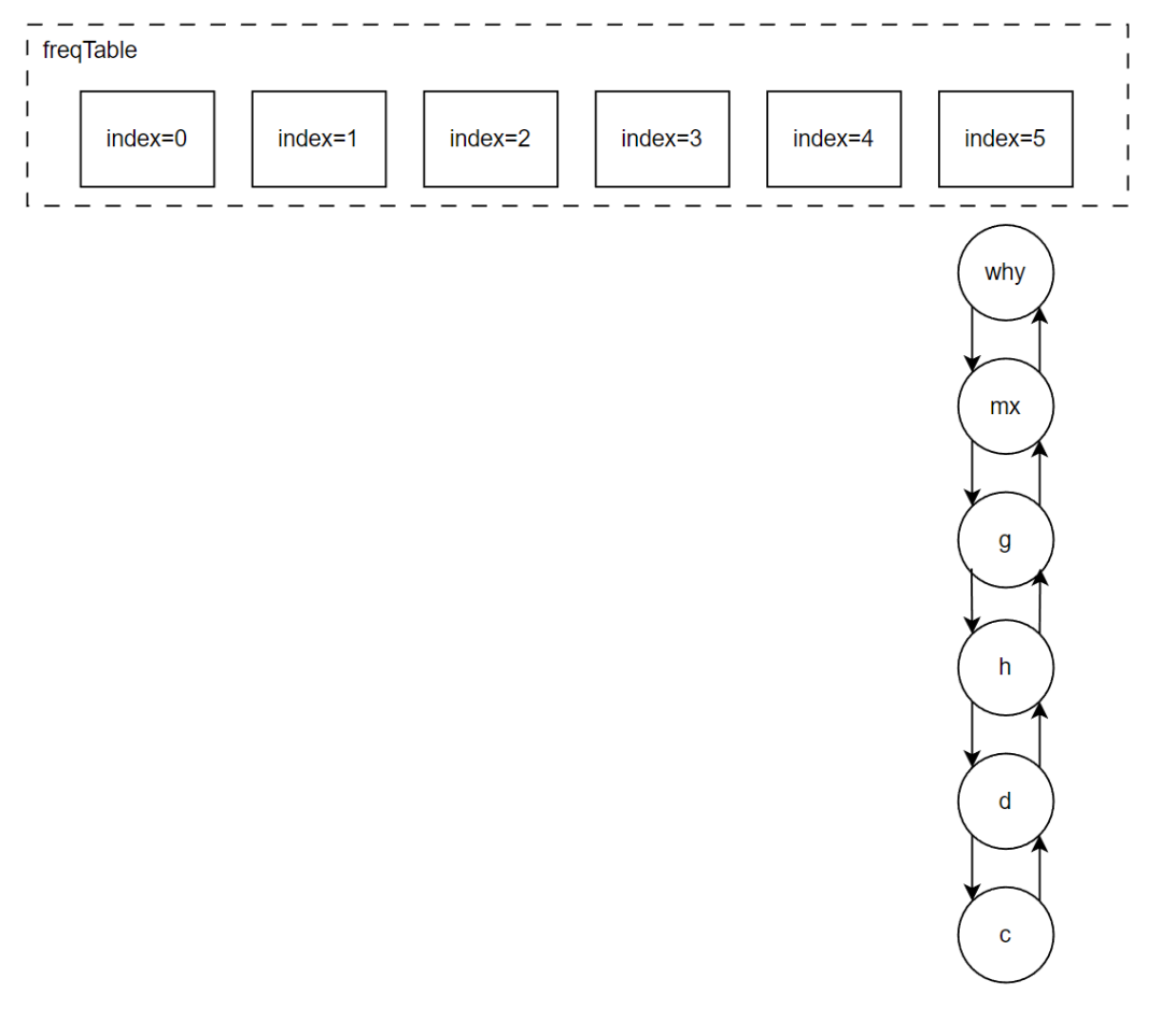 每个元素的频次,即 freq 都是 1。所以链表里面应该是这样的: