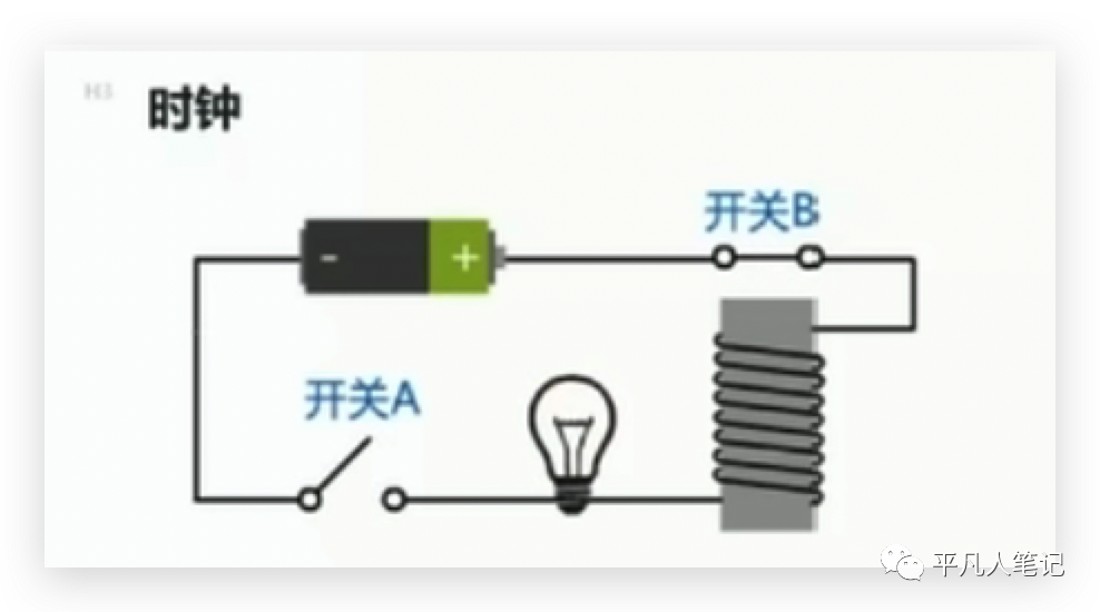 3+5最终怎么计算得到8的?通一次电,计算才往前走一步,所以需要一个时钟电路,时钟电路需要电池信号,线圈一通电就会产生磁场,磁场把开关断下来,断下来之后就不通了,不通了之后,电池没电了,开关闭合,电流又通了,这样来回来去的。