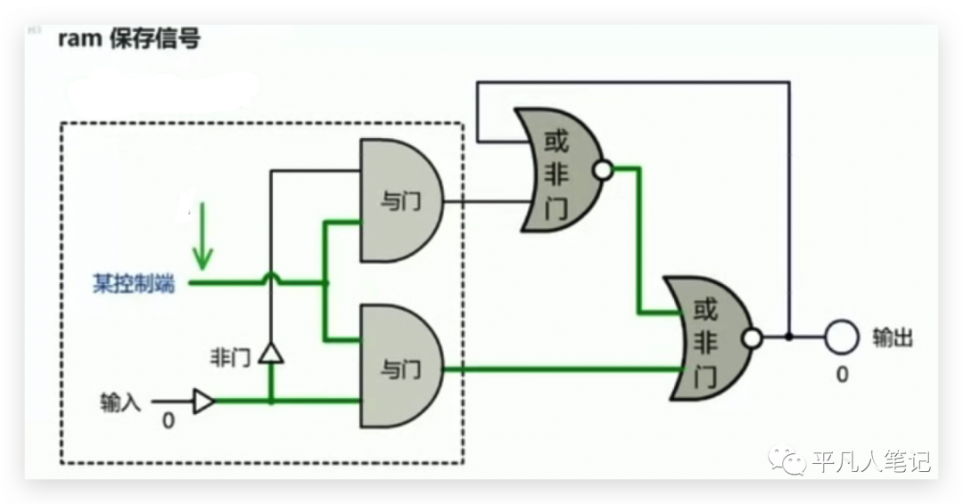 后面就发明了锁存器,总而言之用更深的电路实现一个锁存器,锁存器的作用是不管控制端输入一个什么,最终这里的输出会保存下来即只要最终的电是通的,就会保存下来,这个就是内存或寄存器。