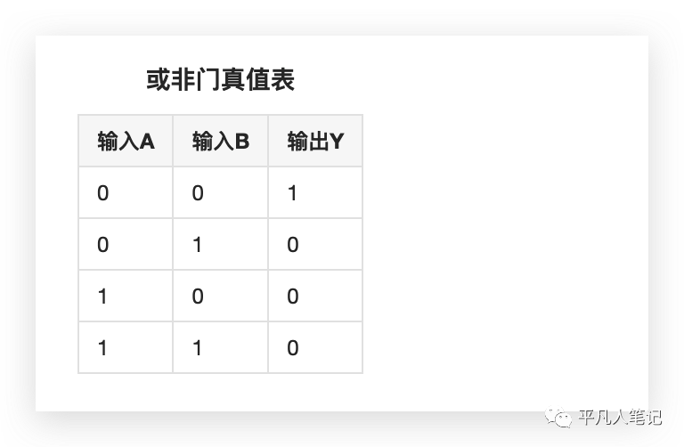 当任一输入端(或多端)为高电平(逻辑“1”)时,输出就是低电平(逻辑“0”);只有当所有输入端都是低电平(逻辑“0”)时,输出才是高电平(逻辑“1”)。