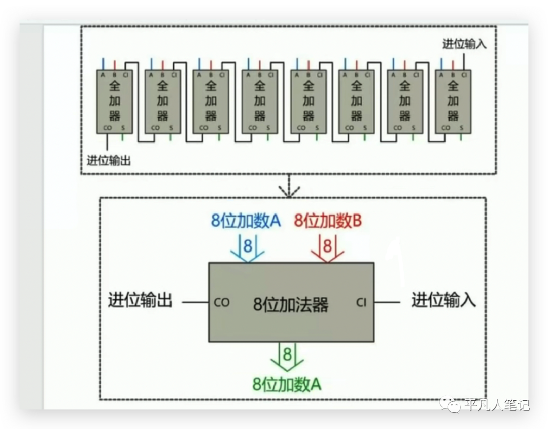 这个加法器是对1位进行相加,计算8位的话,就是把加法器用新的电路串联起来,
