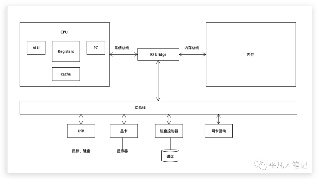这是一个计算机最简单的构成,其中最核心的部件一个是cpu,一个是内存,其他都可以称为外设(USB、显卡、磁盘控制器、网卡驱动)。