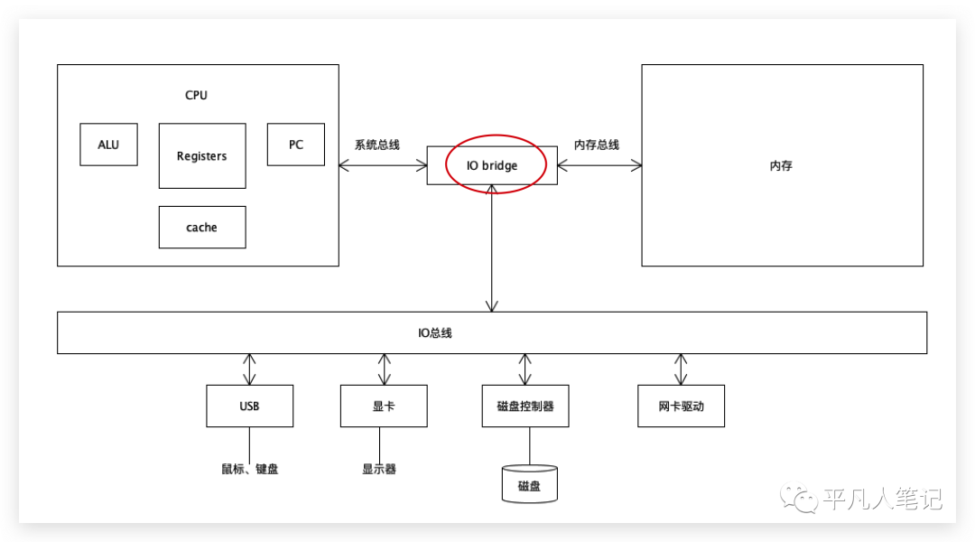 二进制01可以把它看成一个指令,比如add指令,也可以看作是数据,比如5,如何区分这个二进制是指令还是数据?这是由IO Bridge(总线)来控制的,总线是从内存到CPU之间的一条数据线路。