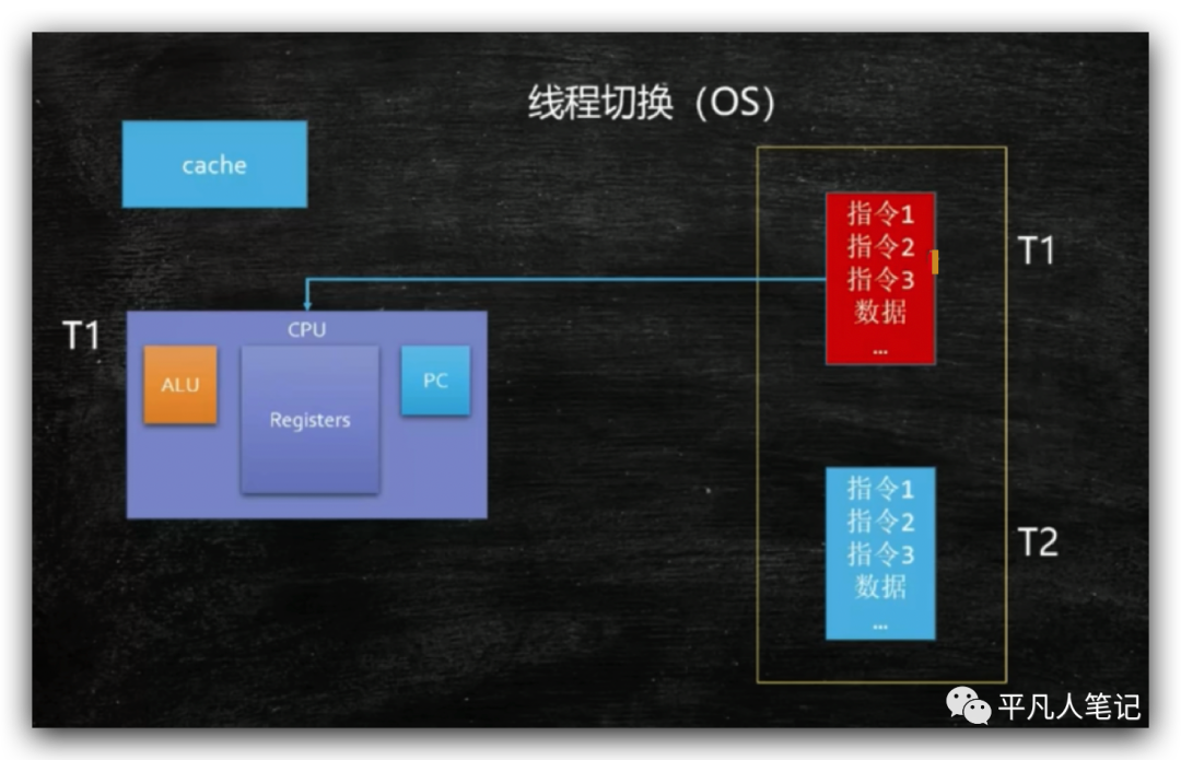 cpu正在执行t1,t1有它自己的指令和数据,这些数据是需要放到寄存器的,在t1没有执行完的时候,比如10多毫秒的时间片到了,切换到t2,t2执行完回来又轮到t1,t1不需要从头开始执行,要把t1执行到哪里了给记录下来,保存好上下文;t1执行到了哪条指令以及t1在寄存器是什么状态,全部放到一个缓存里,这个缓存是位于整个进程空间的,这叫保存现场,这就是线程切换的过程,但缓存宕掉了就会丢失,简单的理解为存储到了内存里,严格来讲会存到了锁存器中。
