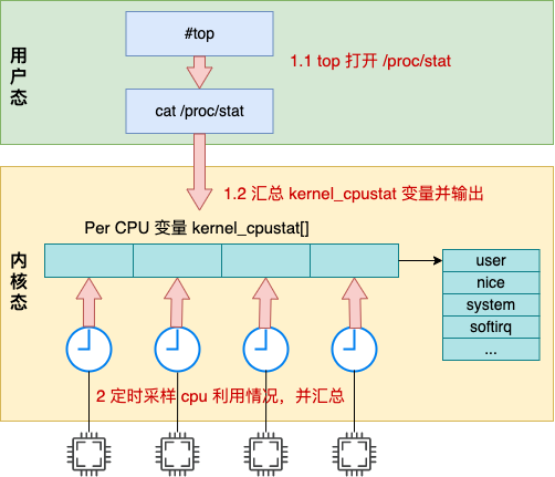 top 命令是读取的 /proc/stat 中输出的 cpu 各项利用率数据,而这个数据在内核中的是根据 kernel_cpustat 来汇总并输出的。