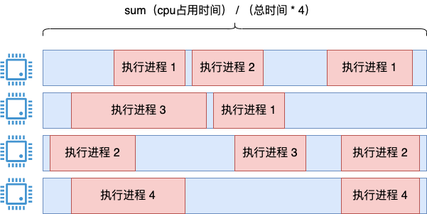 其中一个思路是把所有进程的执行时间都加起来,然后再除以系统执行总时间*4。