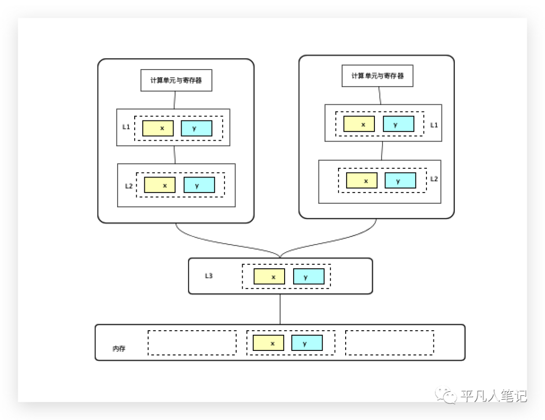 假设有2个数据x、y位于同一缓存行,在第一个计算单元(cpu或线程)里面只使用了x,第二个线程里面只使用了y,虽然在内存中是同一份数据,但是到缓存之后,是2份拷贝数据,每一个用到它的cpu都会有它的一份拷贝存在,一个cpu对这份数据做了修改之后,另外cpu也需要同步到最新的数据。