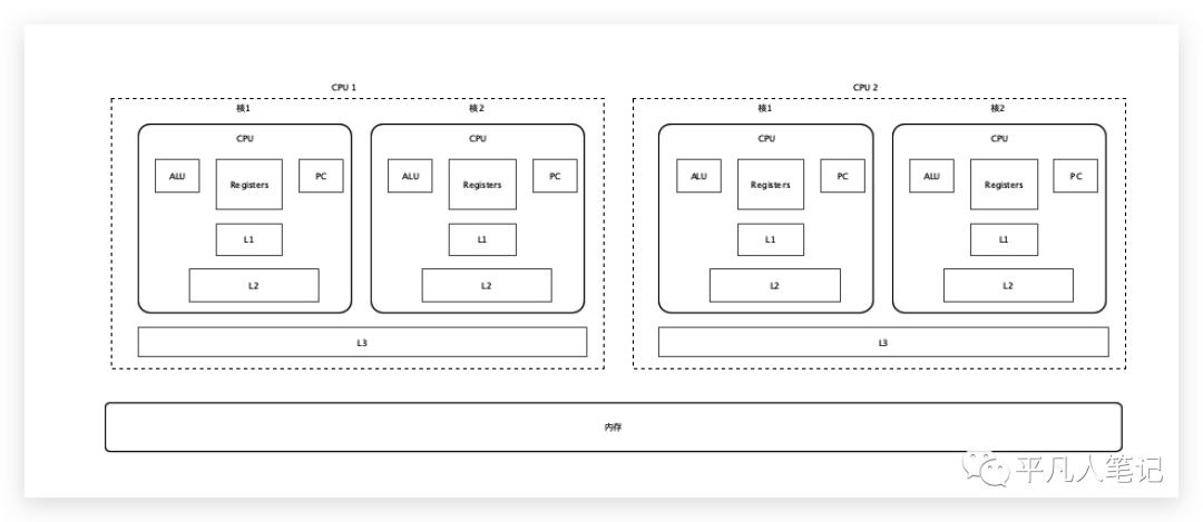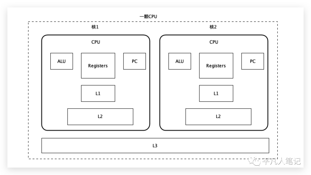 这是一颗cpu,在cpu内部往往有多个核存在,每一个核都有自己的ALU、寄存器、程序计数器,一级缓存和二级缓存都在这个核里,三级缓存是多个核共享。