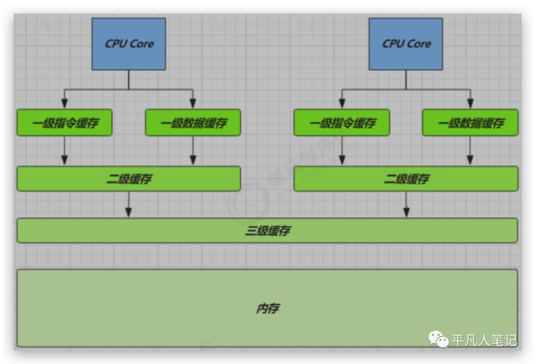 ALU的计算单元需要把读到的数据放到寄存器,寄存器会去寻找想要的数据,首先去一级缓存找,没有的话,再去二级缓存找,还没有的话,再去三级缓存找,三级缓存把数据传给二级缓存,二级缓存把数据传给一级缓存,一级缓存把数据传给寄存器,下一次再访问数据的时候直接去一级缓存中拿。