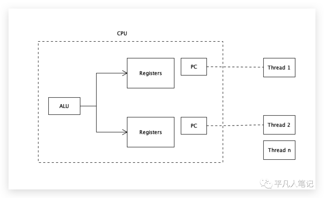 虽然只有一个计算单元ALU,但是有2套存储单元、2套寄存器、2套程序计数器,一个核可以装2个线程的数据进来,计算单元轮着计算,2个线程就不需要来回切换了,即一个核2个线程,2个核4个线程,4个核8个线程。