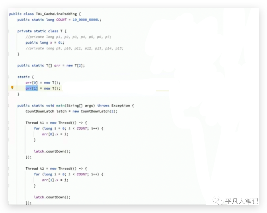 一个long类型的x是8个字节,这2个x位于同一个缓存行的概率极大(尤其这2个x位于同一个数组,在内存中是挨着的),2个cpu分别修改一个x,2个x在一方cpu都有缓存,修改了其中一个需要通知另外一个,每改一次通知一下,总之在修改的时候需要触发一种机制需要另外的cpu跟我保持一致,如果这样的话,耗时当然会比较长。