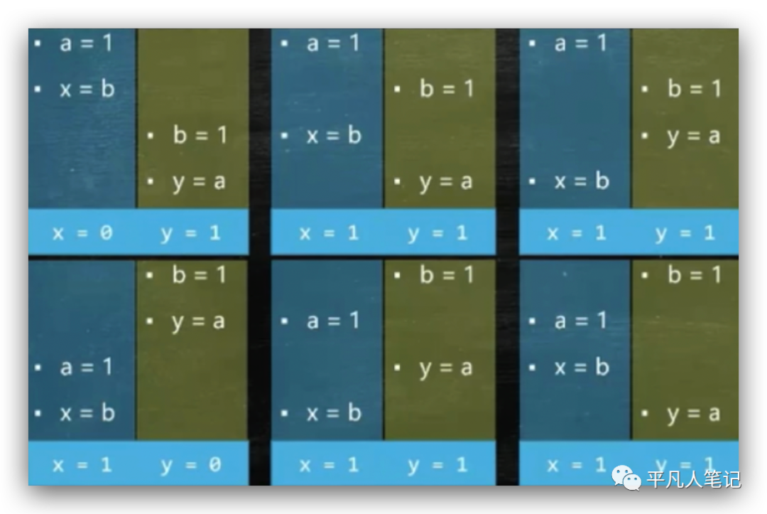 这6种排列组合的结果无论如何都不可能得到x=0、y=0的情况即只要按照顺序执行,绝对不会出现x=0、y=0。