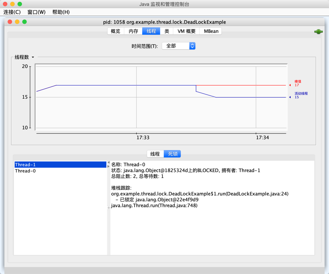 从上图可以看出,当我们切换到线程一栏之后就会直接显示出死锁信息,之后点击“线程 Dump”生成死锁的详情信息,如下图所示: