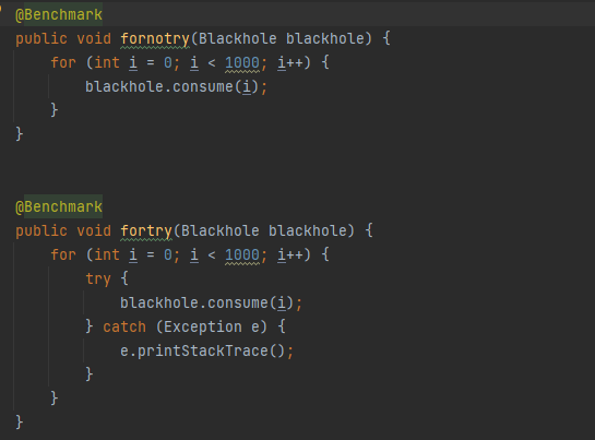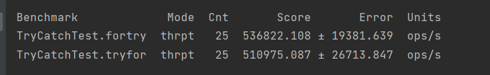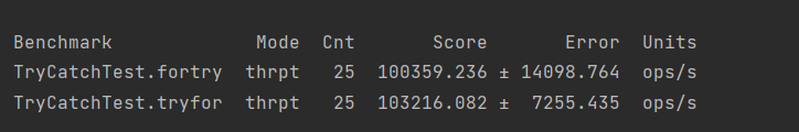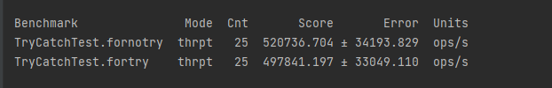 +-差不多,直接看前面的分数对比,没有 ry-catch 的性能确实好些,这也和书中说的 try-catch 会影响 JVM 一些特定的优化说法吻合,但是具体没有说影响哪些优化,我猜测可能是指令重排之类的。