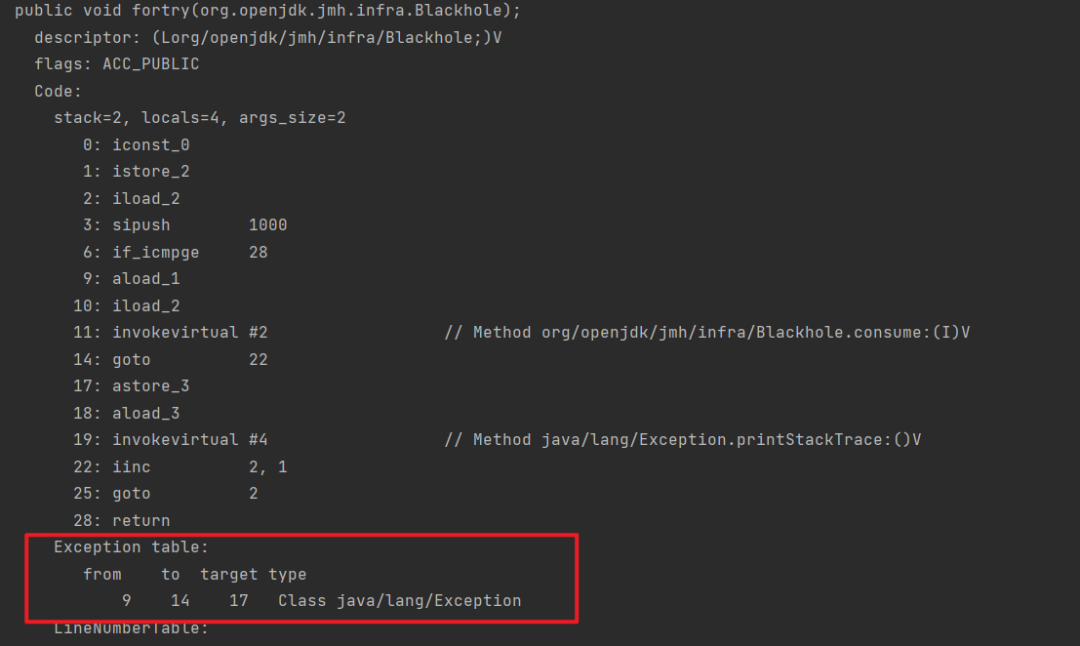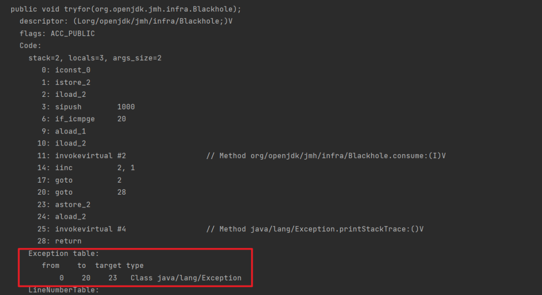异常表记录的是 0 - 20 行,如果这些行里面的代码出现问题,直接跳到 23 行处理。