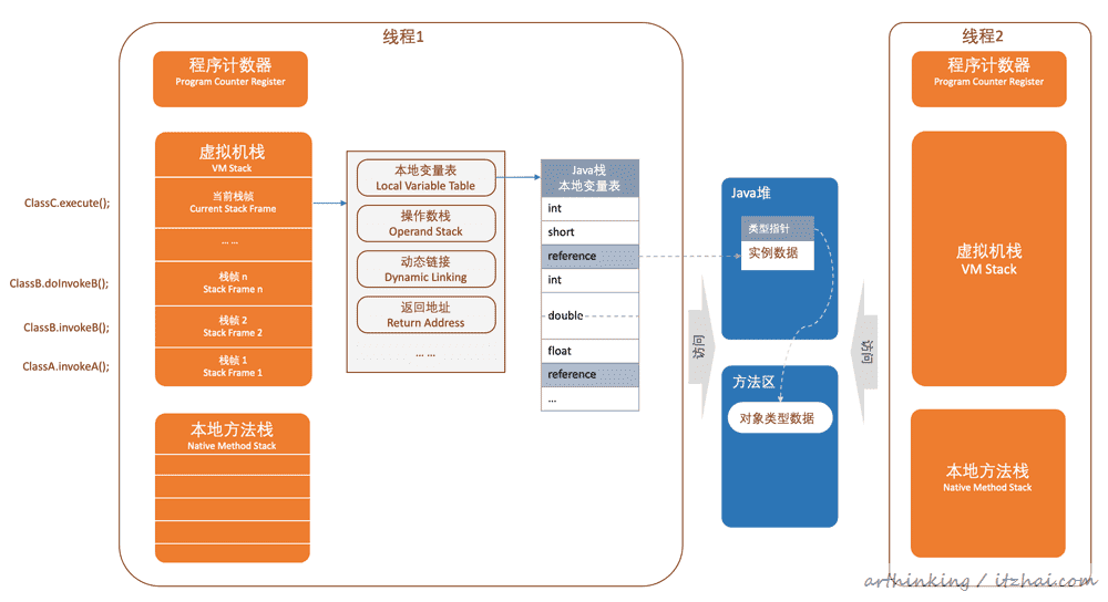 虚拟机栈:假设有如下调用关系:ClassA.invokeA() -> ClassB.invokeB() -> ClassB.doInvokeB() -> ClassC.execute(),则会生成以上的虚拟机栈,每个方法调用,都有一个栈帧入栈,调用完成,栈帧从虚拟机栈上出栈;虚拟机栈是一个LIFO的栈; -