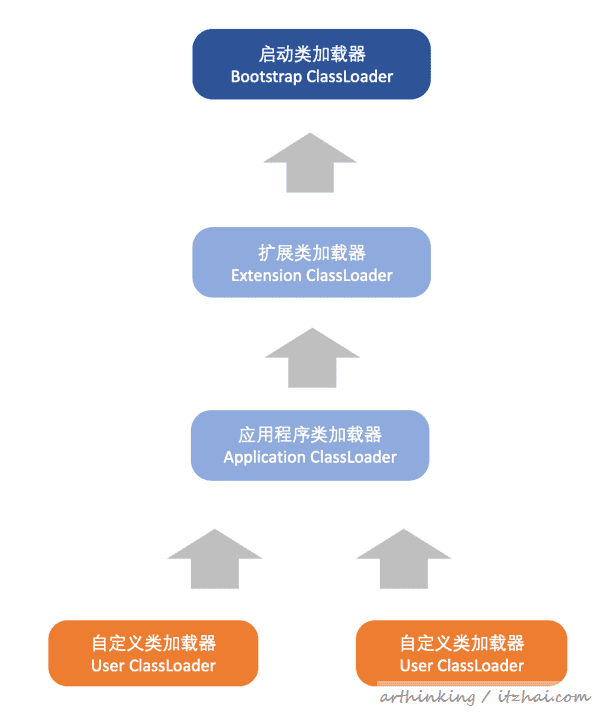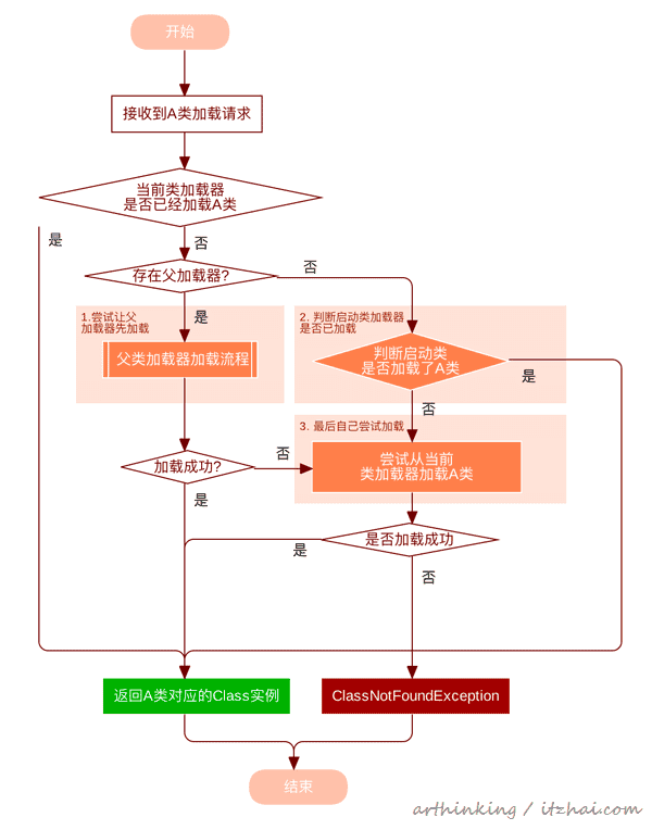 一个类加载器收到了类加载请求,不会自己立刻尝试加载类,而是把请求委托给父加载器去完成,每一层都是如此,所有的加载请求最终都传递到最顶层的类加载器进行处理;