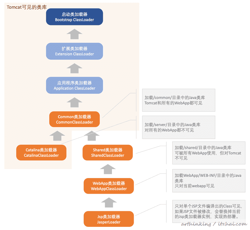 /WebApp/WEB-INF 目录中: 这里面的类库仅仅可以被此Web应用程序使用,对Tomcat和其他Web应用程序都不可见。 为了实现以上各个目录的类库可见性效果,Tomat提供了如下的自定义类加载器: