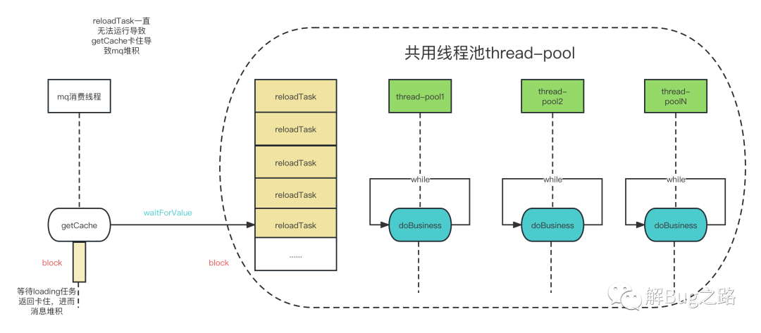 笔者看到这里就直接明白了。guavaCache的refreshWrite和xxxTask共用了一个线程池。xxxTask是个无限循环,将线程池的所有线程占住。这样guavaCache的refreshWrite就永远躺在线程池的blockingQueue里面没有任何运行的机会。如下图所示: