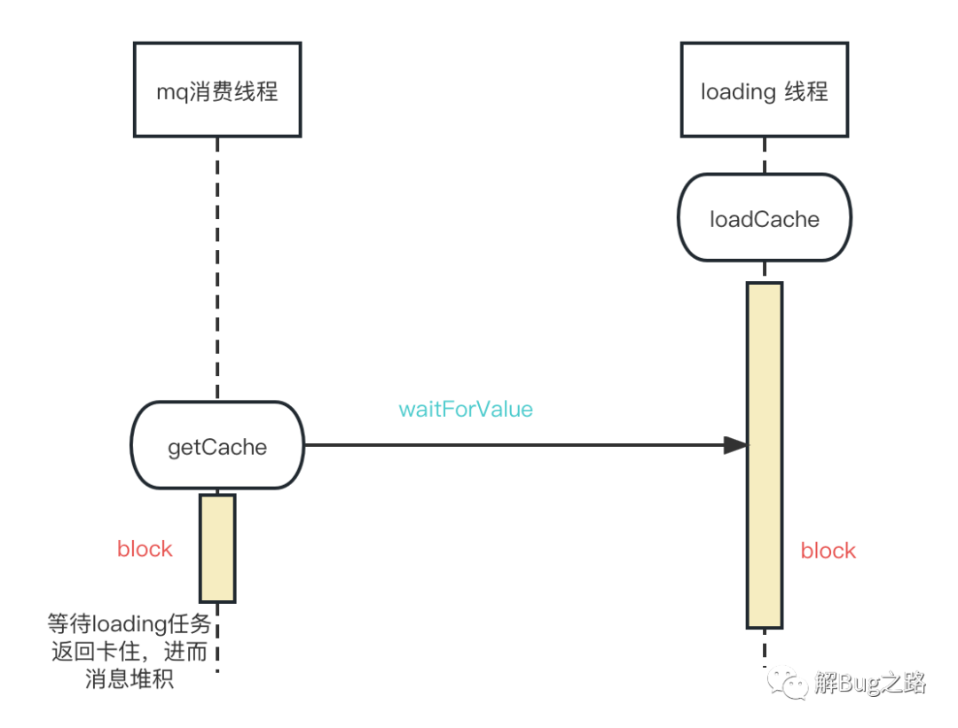 在设置的expire时间之后,由于这时旧值已经过期,又由于valueReference.isLoading,所以mq线程(也就是getCache的线程一直卡住)。
