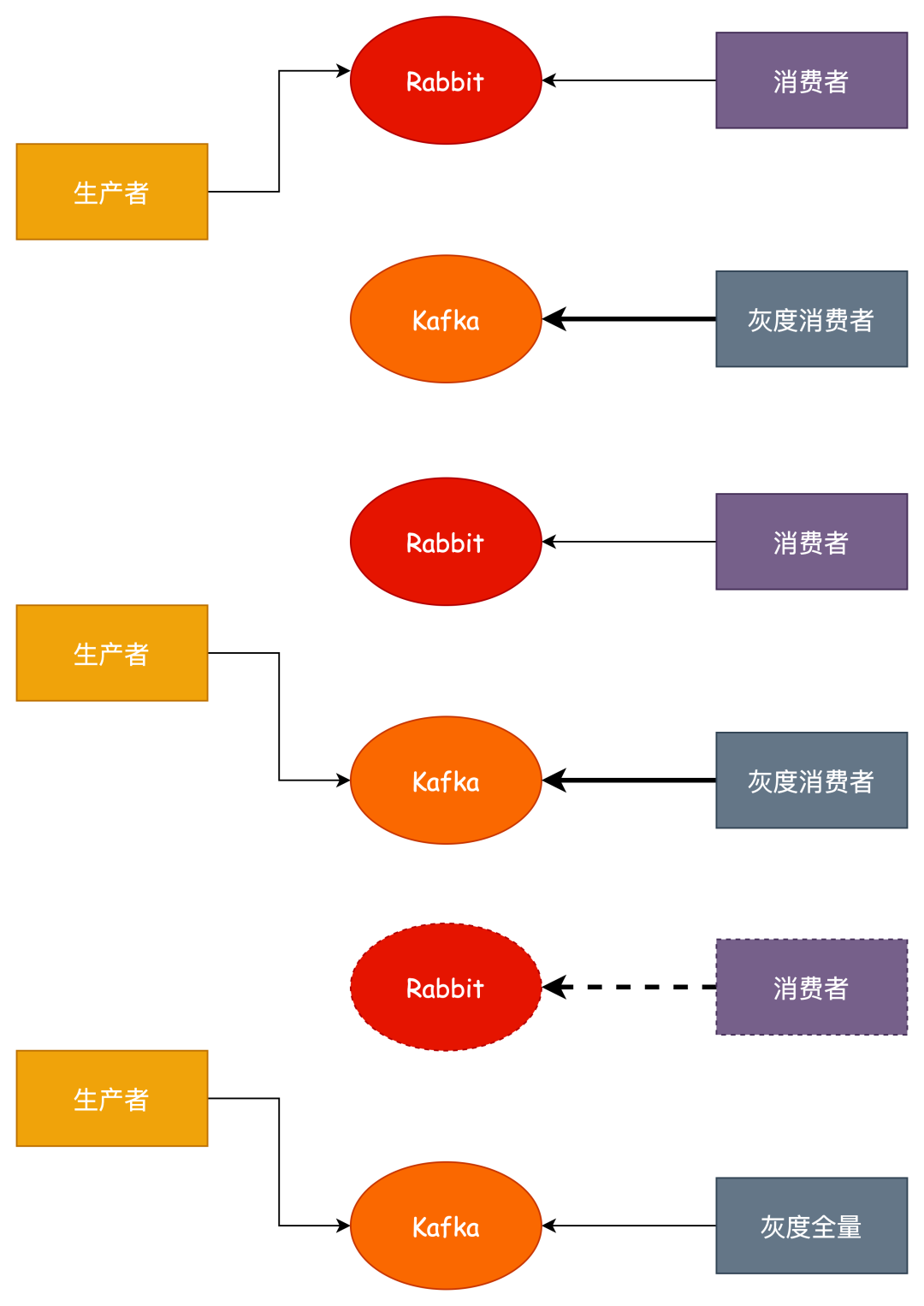 3. 等待老的 Rabbit 消息消费完毕,下线,这里存在一个问题就是在进行灰度之后全量的过程中可能造成消息丢失的情况,对于这个问题的解决方案要区分来看,如果业务允许少量的丢失,那么直接全量即可,否则需要对业务做一定的改造,比如增加开关,全量之前关闭发送消息,等待存量消息消费完毕之后再全量。