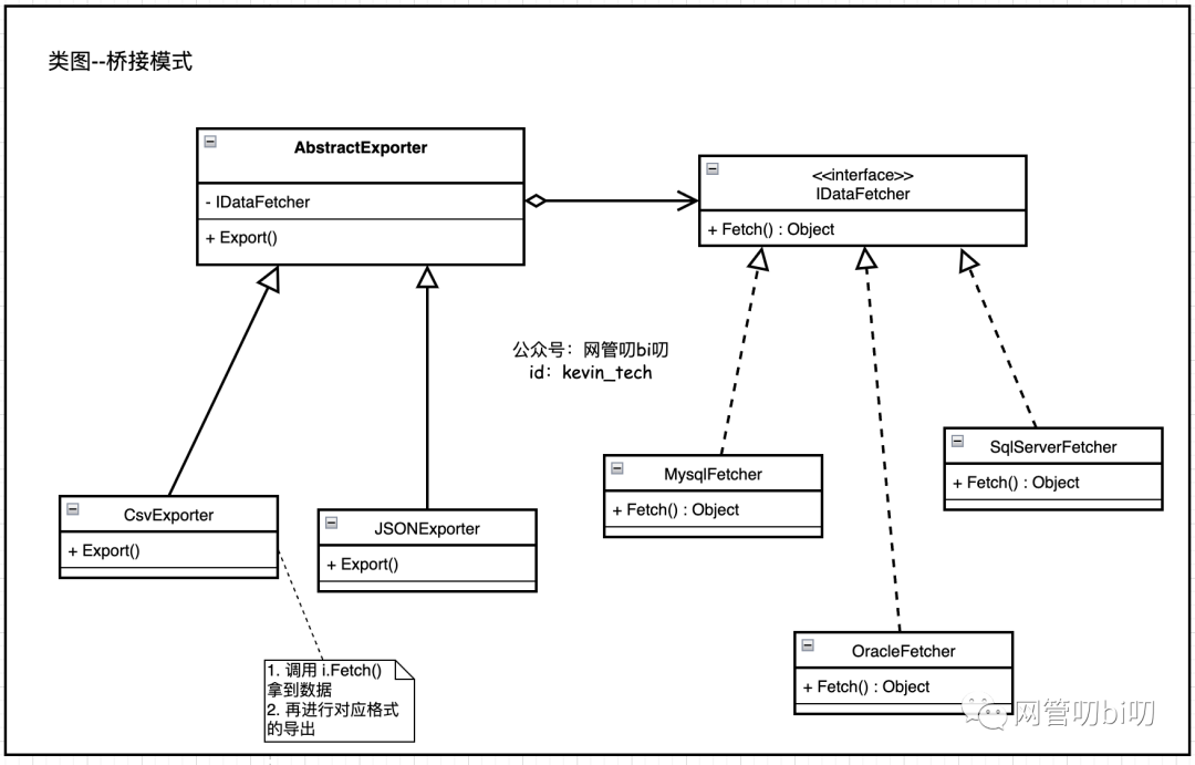 然后我们在定义两个数据导出器IDataExporter的实现:CsvExporter和JsonExporter,从类图里我们可以看到IDataExporter的实现会通过一个内部属性持有对IDataFetcher的引用,即通过组合的方式来完成我们的数据导出器在导出格式和数据源类型两个维度上的自由搭配。