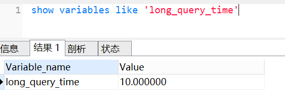 我们还可以使用show variables like 'long_query_time'命令,查看超过多少时间,才记录到慢查询日志,如下: