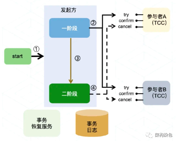 TCC 模式要求由业务侧通过编码实现 Try、Confirm、Cancel 3 个方法,TCC 的 Try 操作作为一阶段,负责资源的检查和预留;Confirm 操作作为二阶段提交操作,执行真正的业务;Cancel 操作作为二阶段回滚操作,执行预留资源的取消,使资源回到初始状态。