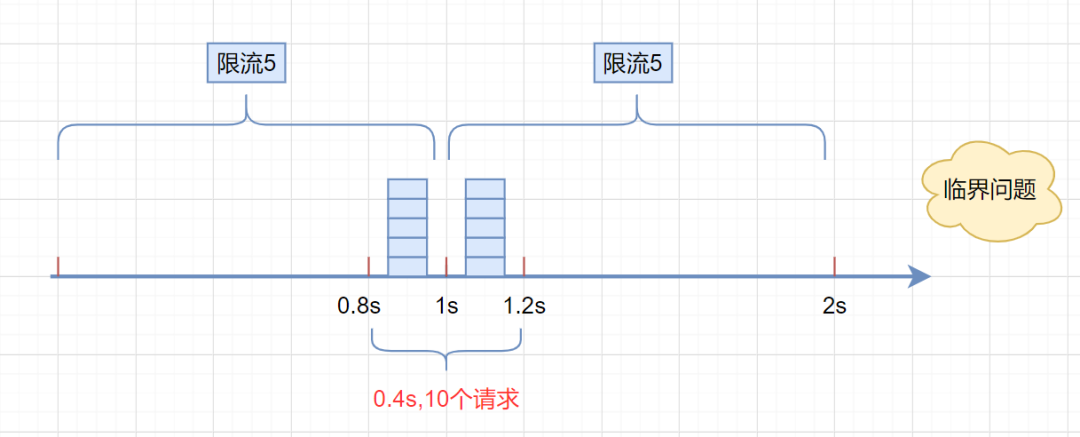 缺点:存在 明显的临界问题,比如: 假设限流阀值为 5个请求,单位时间窗口是1s,如果我们在单位时间内的前0.8-1s和1-1.2s,分别并发5个请求。虽然都没有超过阀值,但是如果算0.8-1.2s,则并发数高达10, 已经超过单位时间1s不超过5阀值的定义啦。