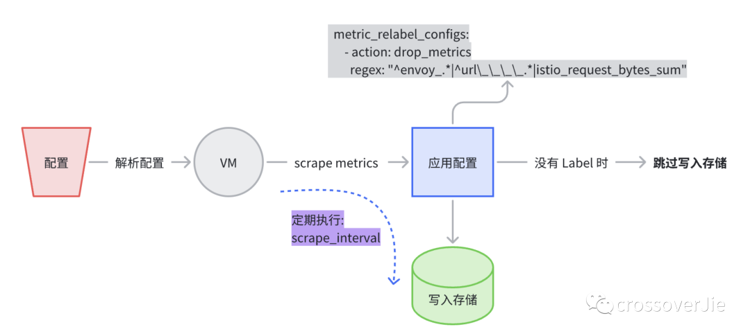 根据配置的抓取间隔时间( scrape_interval)抓取数据,拿到的每一条数据都需要通过metric_relabel_configs的应用。 -
