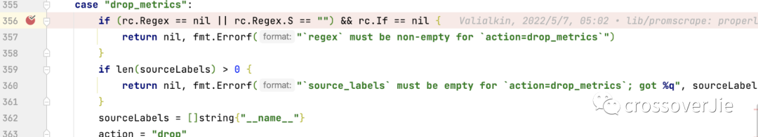 这里还有一个小细节,源码里判断的 action 是 drop,而我们配置的是 drop_metrics,其实 drop_metrics 也是 drop 的一个封装而已。
