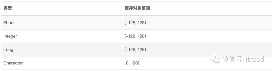 相同的包装类型比较,会把原始类型自动装箱为包装类型比较,注意部分包装类型部分范围对象会缓存到一个cache数组中,每次从数组中取值,如下表所示: