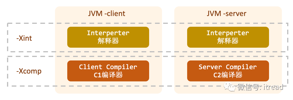 %JAVA_HOME%/jre/bin 下面有 server 和 client 文件夹,里面分别对应是C2和C1的实现。一次只能使用其中一个编译器,通过 -client 和 -server 参数指定。这个时候引入了三种编译模式:-