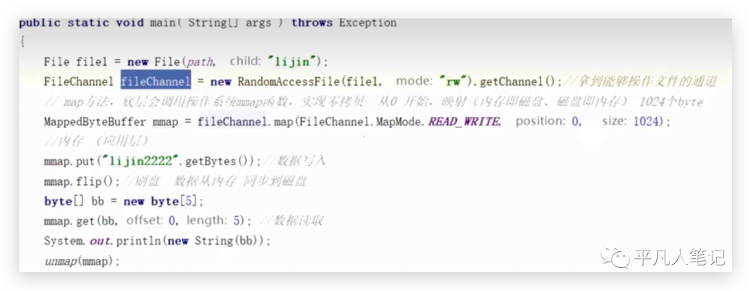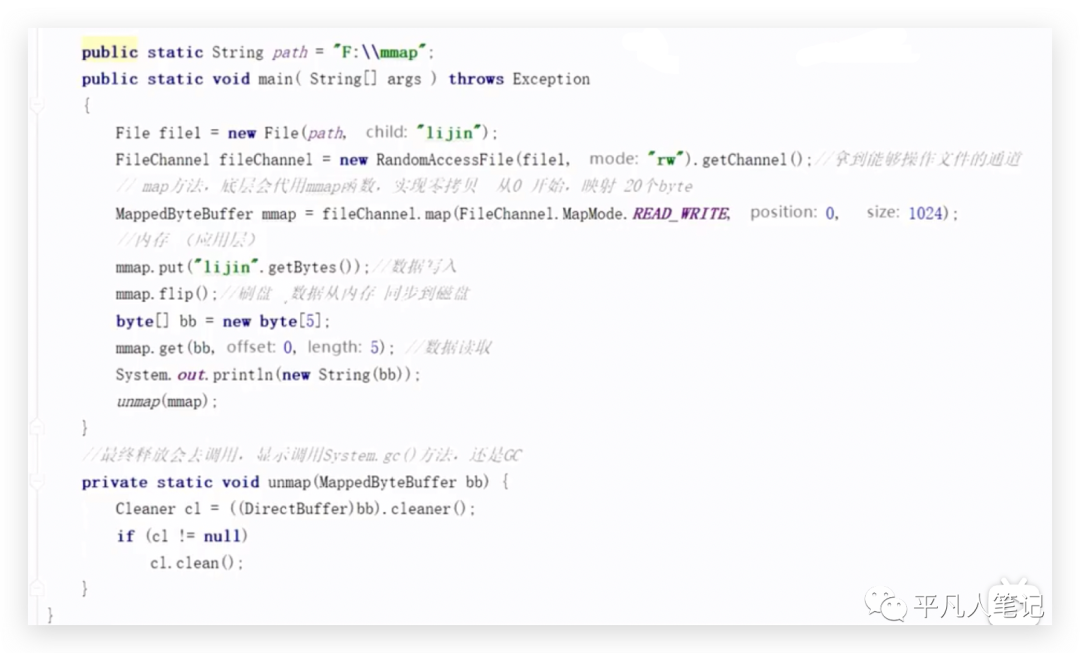 mmap是内存文件通过FileChannel调用map方法间接调用的,设置读写模式,文件映射到底可以读还是可以写,内存映射的位置即从哪里开始,0表示从头开始,内存映射大小为1024即这个文件可以映射1kb左右,拿到这个buffer之后,就可以进行写入,这个ByteBuffer和Hashmap是一样的方式,直接put把字符串转换成byte数组进行写入,写入完之后,再去调用flip方法进行刷盘,这个数据就可以同步到磁盘了,当然刷完盘之后,还可以拿出来,通过mmap.get把里面的前5个数据读取出来,读取之后还可以打印,