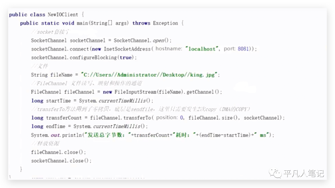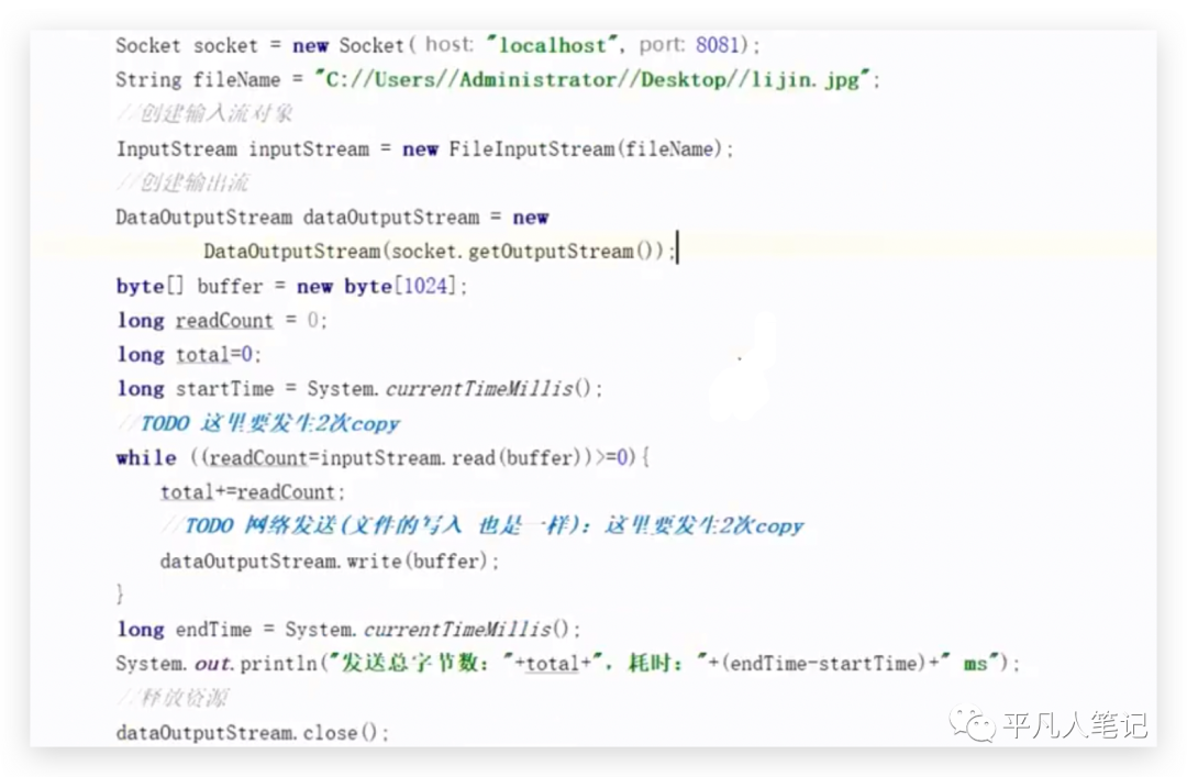 传统的方式本质上和文件读取是一样的,这是通过流的方式读取,while true不断的读并且累加,读完之后,拿到了buffer,再写网络,网络就通过socket创建的getOutputStream(文件的输出流、socket的输出流)转到DataOutputStream。