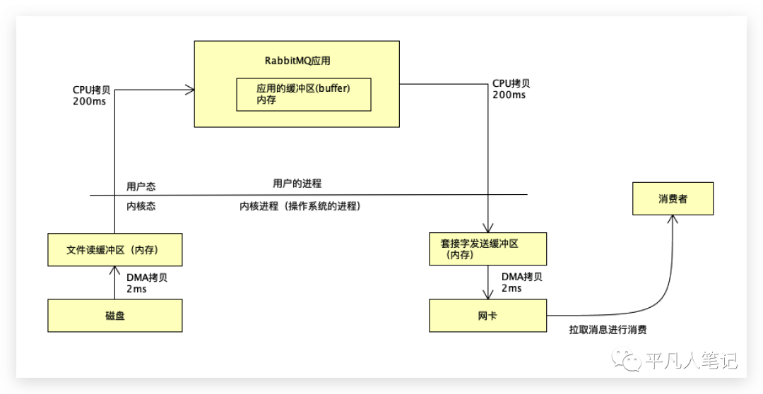 这种方式共有4次拷贝,耗时为422毫秒,这是RabbitMQ的情况,而RocketMQ的mmap发送只有204毫秒,DMA拷贝速度一般是CPU的百倍。