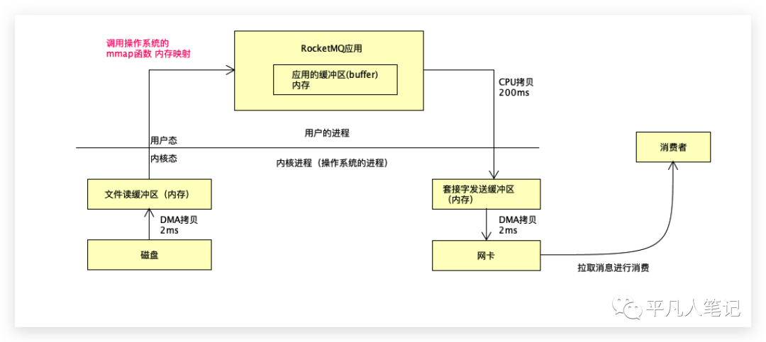 在RocketMQ中采用一种MMAP的零拷贝技术,本身是做内存映射,当内存的应用缓冲区调用操作系统的mmap函数,可以做一个内存映射。