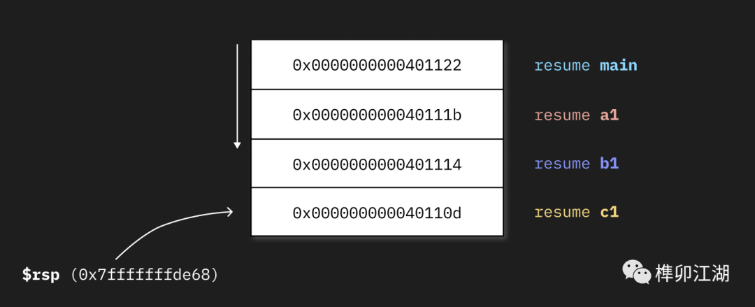 要遍历堆栈,我们必须遵循上面生成的链表,读取每个保存的$rbp之前压入的值,这将使我们的堆栈帧,直到$rbp为零,意味着已经到达了堆栈的末尾。