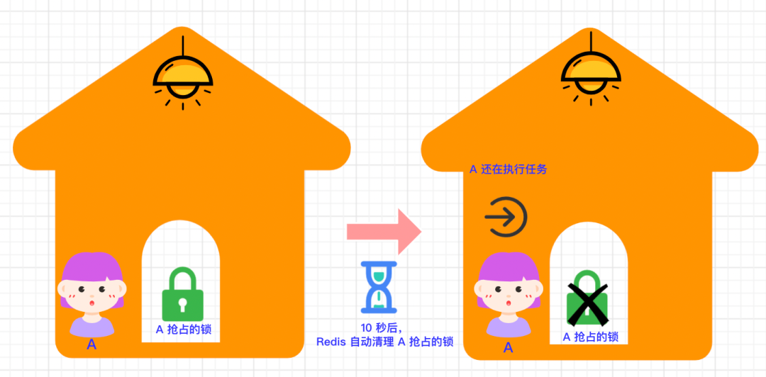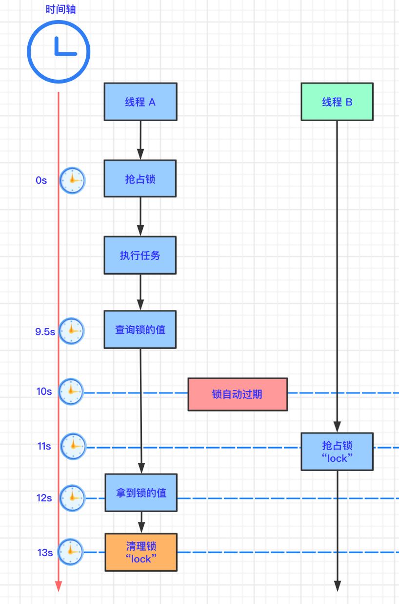 时刻:13s。线程 A 还是拿自己设置的锁的值和返回的值进行比较,值是相等的,清理锁,但是这个锁其实是线程 B 抢占的锁。