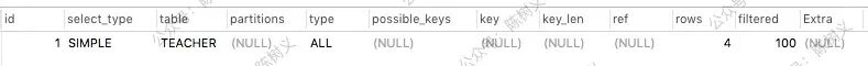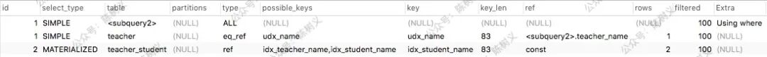 上面的输出一共有 3 条记录,其中第 1、2 条的 ID 相同,第 3 条 ID 不同。那么其执行顺序就是 ID 值越大,其越早执行。ID 相同的,按顺序执行。上面的例子,最早拿 teacher_student 表的数据,之后是一个子查询组成的表,最后拿 teacher 表的数据。结合 SQL 分析,这也符合我们的常识。因为我们必须先把子查询的值算出来,因此需要先把 teacher_student 表里的数据拿出来,之后才可以拿去 teacher 表里查询。